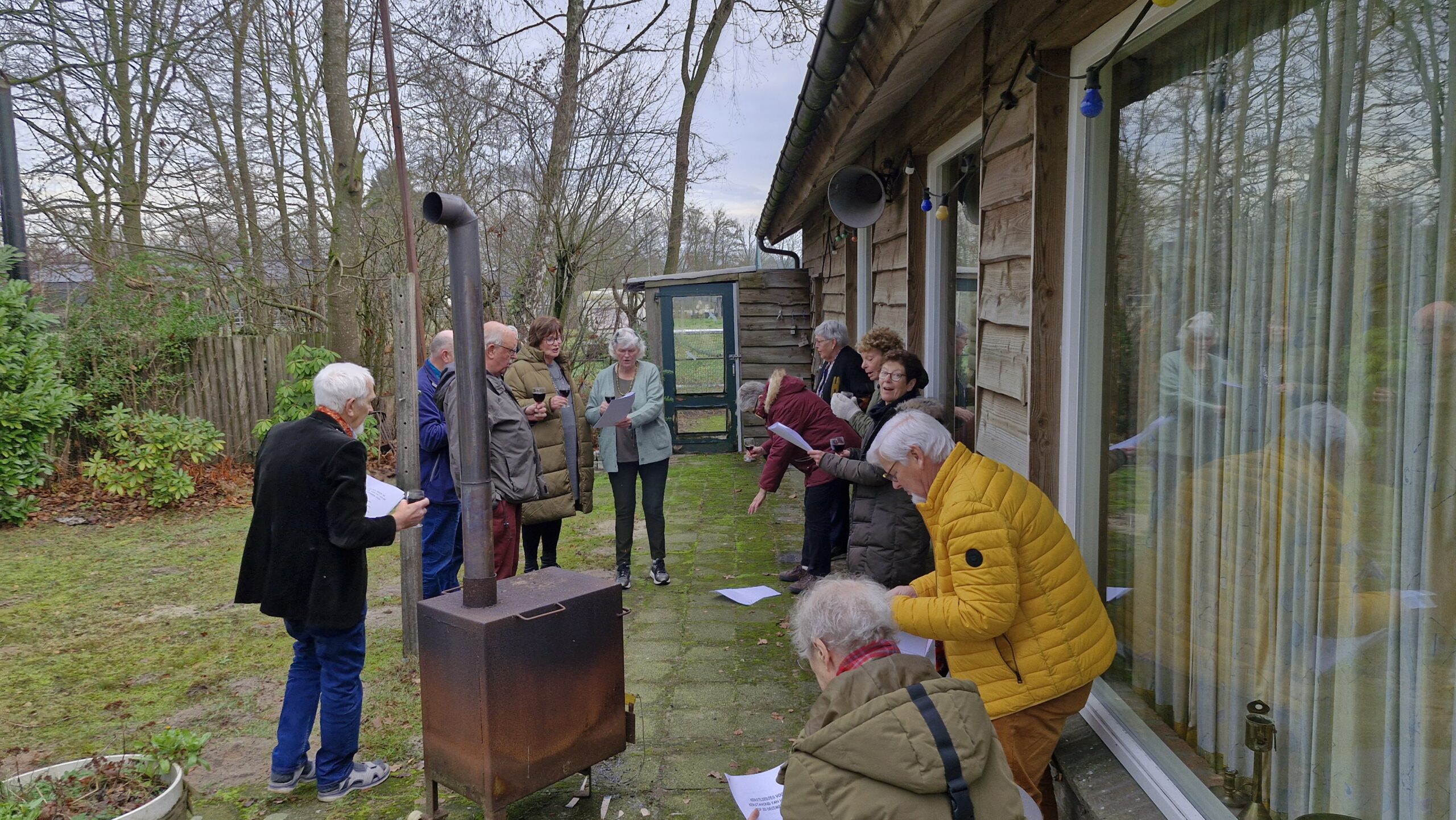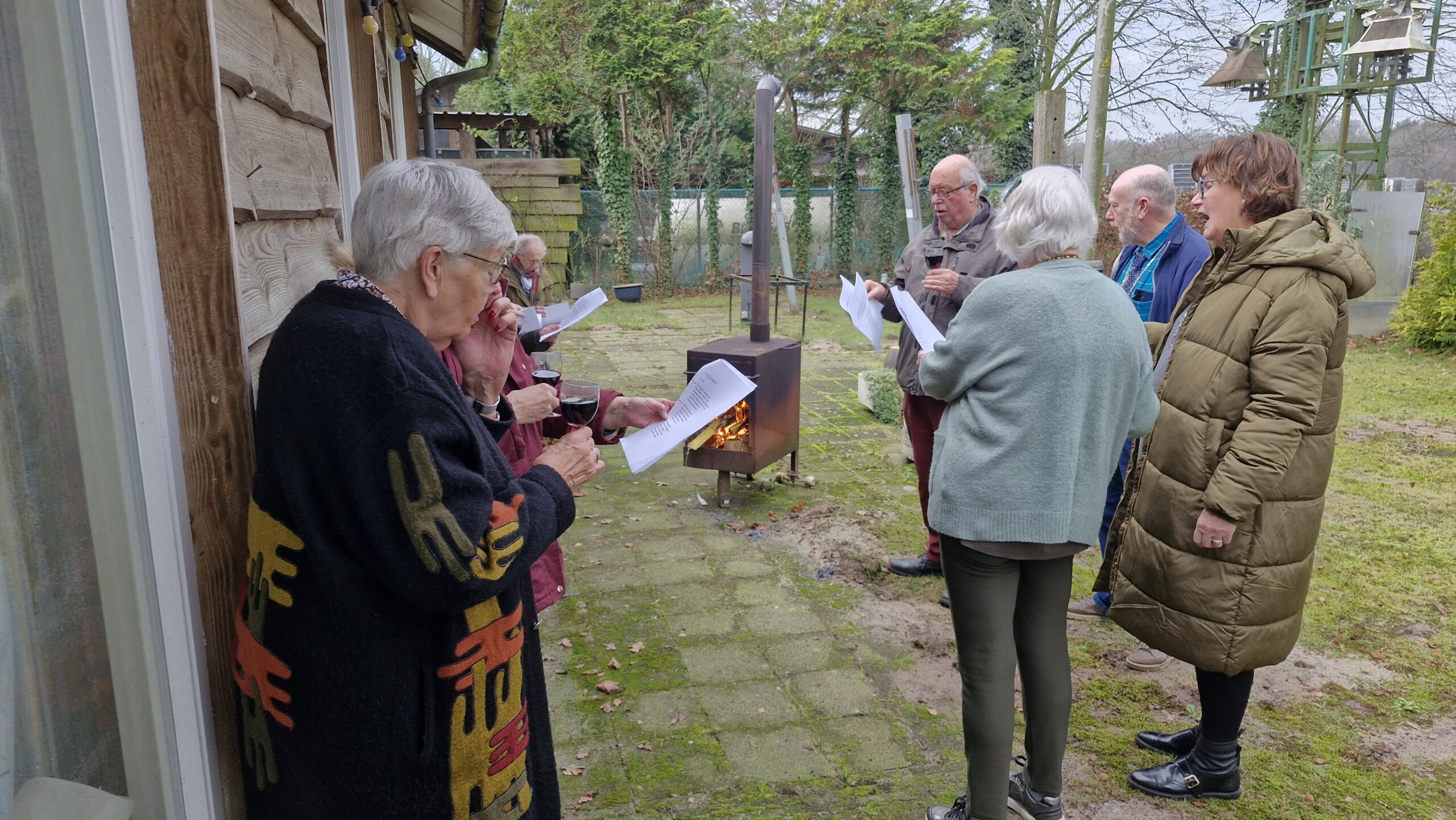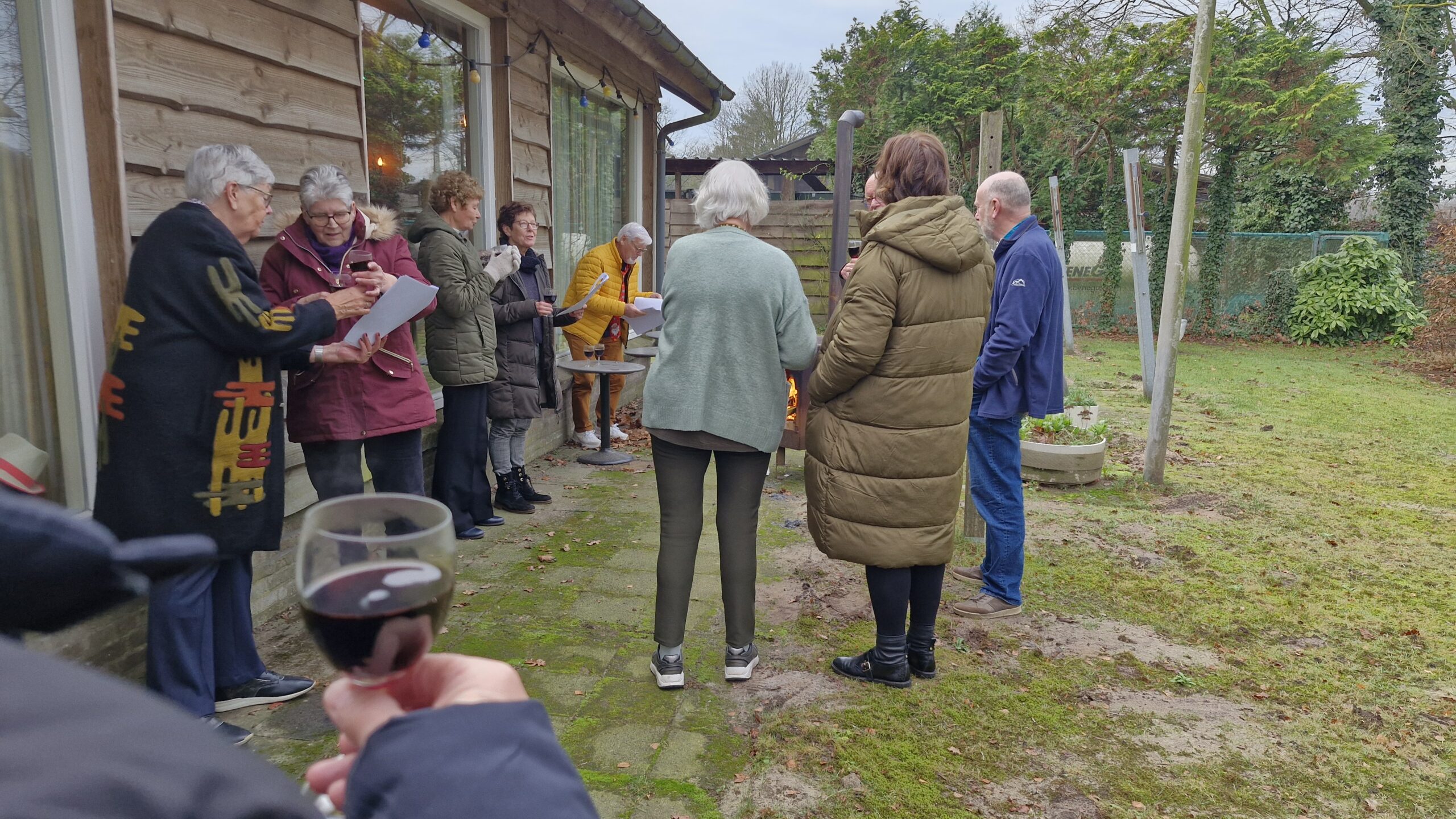 We startten met koffie en een heerlijk gebakje, verzorgd door Ton. Daarna las Annie een passend kerstverhaal voor en zongen we samen kerstliedjes uit de bundel. Met een glas glühwein gingen we vervolgens naar buiten, waar we bij het vuur gezamenlijk Stille Nacht zongen – een bijzonder moment.