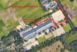 Vanaf de parkeerplaats loop je vóór de manege langs. Zodra je het gebouw voorbij bent, sla je linksaf en volg je het pad naar de “Gildehoek”, ons gezellige clubhuis.